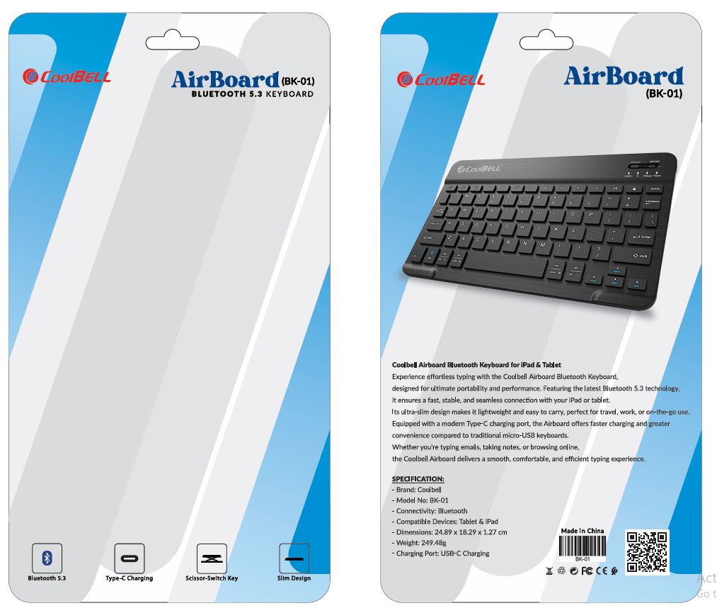 Brand: Coolbell Model: BK-01 Connectivity: Bluetooth Compatible Devices: Tablet / iPad Dimensions: 24.89 × 12.89 × 1.27 cm Charging Port: USB-C (fast charging) Warranty: 1 Year Color: Black The Coolbell Airboard BK-01 is a sleek, wireless Bluetooth keyboard designed to enhance your iPad and tablet typing experience. Featuring a slim...